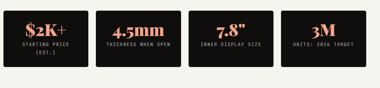• The display is NOT the problem. Apple has reportedly secured foldable OLED panels exclusively from Samsung Display using CoE (Color filter on Encapsulation) technology, which eliminates the polarizer and reduces crease visibility. That deal is locked in for three years.