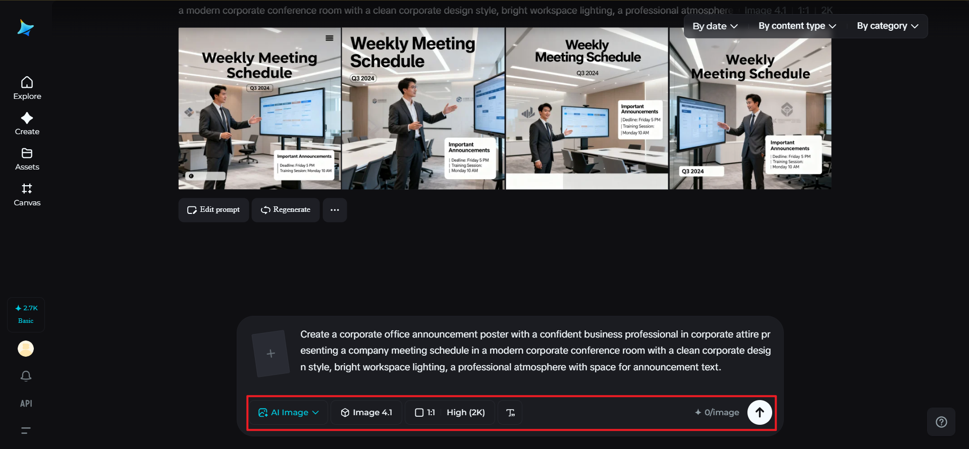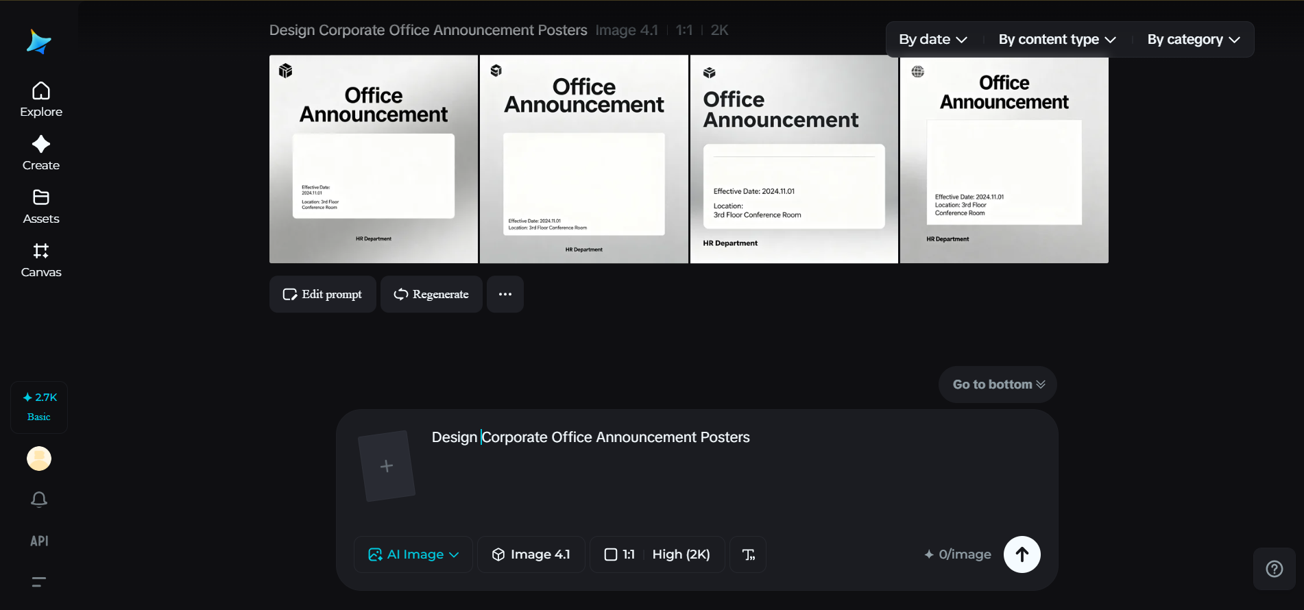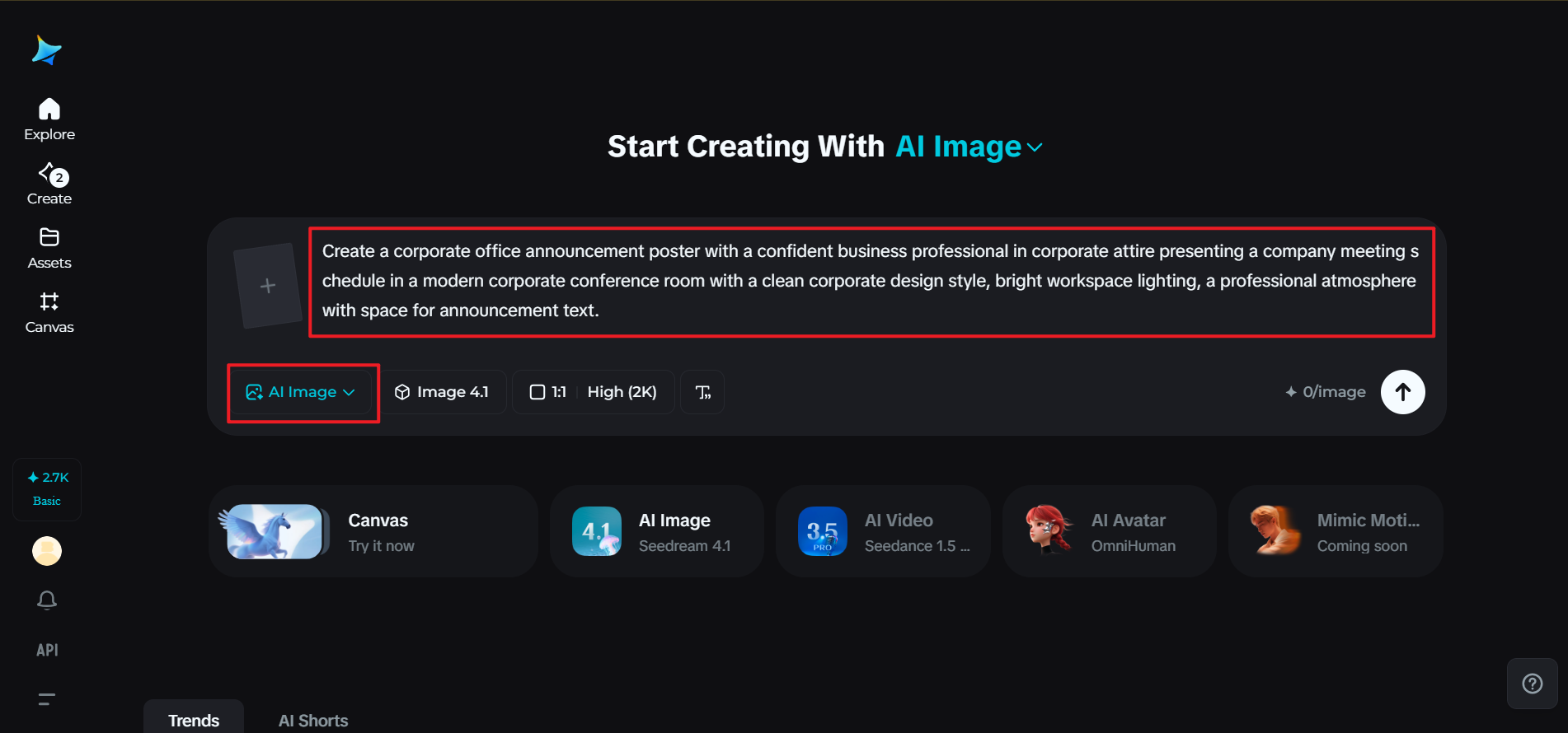 Open Dreamina’s creative workspace and skip the process of selecting an image generator. Begin with writing a detailed prompt on the description of the corporate announcement poster. Describe the office environment, corporate attire, and the announcement message.