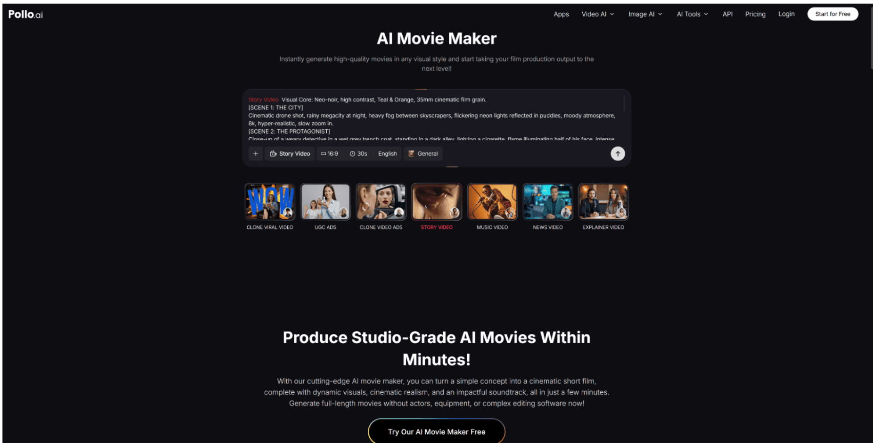 Pollo AI’s AI Movie Maker provides a comprehensive platform for creating cinematic content from scratch. The tool guides you through the process of developing scenes, defining visual styles, and generating movie-quality video sequences that can be assembled into complete short films or standalone scenes.